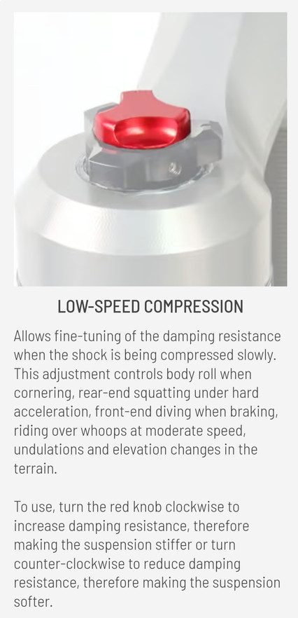 • Front shocks: threaded spring preload + low-speed compression adjustment